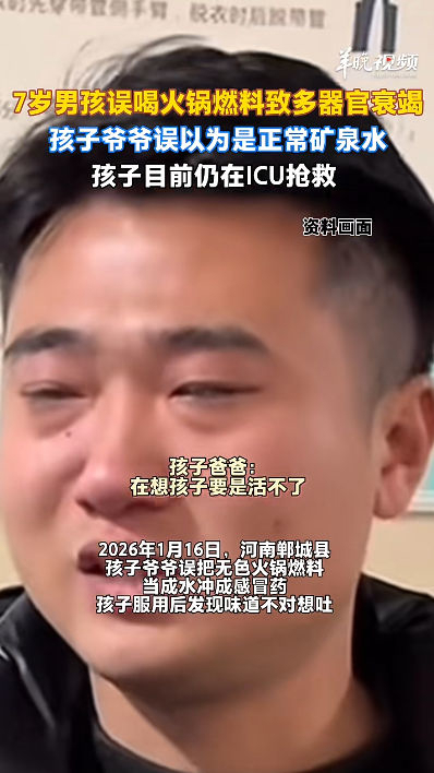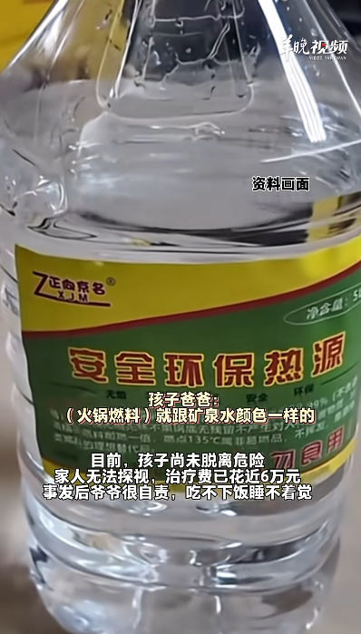 1月16日,河南周口郸城县7岁男孩轩轩因为感冒,爷爷就在屋里找到一瓶矿泉水兑了一点温水,给轩轩冲感冒颗粒。轩轩喝完说味道不对,爷爷尝了一口才发现有问题,赶忙给轩轩爸爸打电话,询问才得知那是轩轩爸爸从朋友火锅店拿过来的无色矿物油燃料。