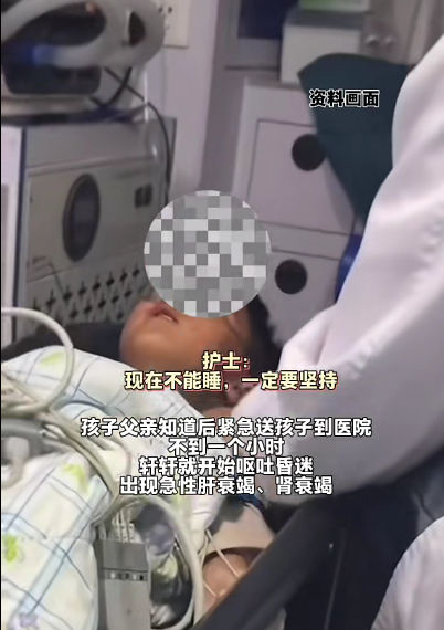 爷爷抠喉咙,轩轩却没有吐,轩轩爸爸立即赶回老家,带着他就医。轩轩爸爸告诉记者,轩轩9点左右吐了一点,11点开始意识模糊,轩轩就医也辗转从县里到市里,再到郑州,当晚23点多,最终被送入省级医院ICU,此时轩轩已经无法说话,呼叫无回应,检查发现他肝肾功能受损,随即接受透析等治疗。